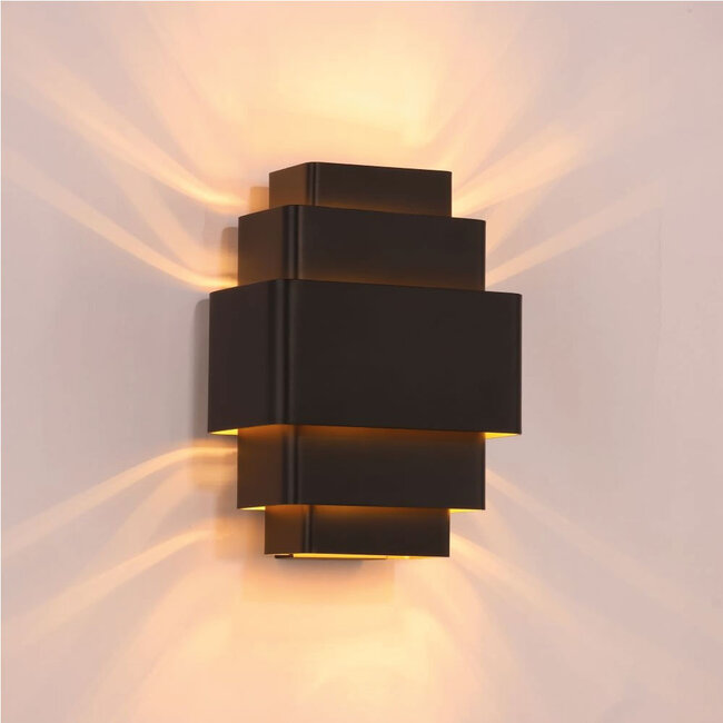 Strakke wandverlichting krijgt meer karakter zodra de vorm echt iets doet in de ruimte. Bij de Artdelight Layers in zwart/goud zit die kracht in de getrapte opbouw van rechthoekige lagen, die samen voor een uitgesproken architectonisch silhouet zorgen. De donkere basis brengt rust en contrast, terwijl het goud juist warmte toevoegt aan het totaalbeeld. Daardoor voelt deze uitvoering modern en krachtig aan, maar tegelijk ook verfijnd genoeg voor interieurs waar sfeer en uitstraling zwaar meewegen.