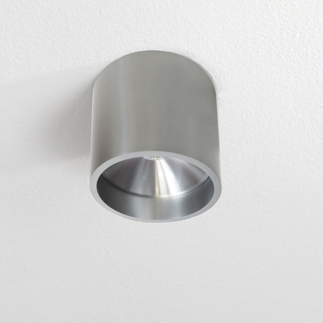 Wat deze uitvoering onderscheidt binnen de serie, is vooral de manier waarop het aluminium het armatuur meer diepte en een verfijnd oppervlak geeft. Waar gepoedercoate varianten vaak sterker op kleur sturen, werkt deze uitvoering meer vanuit materiaal en textuur. Dat maakt hem interessant voor interieurs waarin metaalaccenten, strakke lijnen en een verzorgde technische uitstraling samenkomen, zoals badkamers, kantoren, showrooms, salons en moderne woningen.